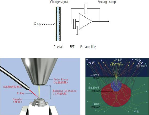單個(gè)X射線光子轉(zhuǎn)化為電荷信號(hào)后在前置放大器的輸出端以臺(tái)階形式疊加在線性增大的電壓信號(hào)上,經(jīng)處理和分析后,可以得到所含元素的特征X射線強(qiáng)度值,通過與標(biāo)準(zhǔn)樣品的X射線能譜對(duì)比修正后得到定量分析結(jié)果。