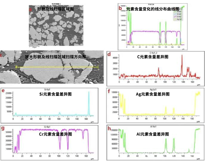 電子束沿著一條分析線進(jìn)行掃描時(shí),可以獲得元素含量變化的線分布曲線。通過與試樣形貌相結(jié)合分析,可以直觀地獲取元素在不同相或區(qū)域內(nèi)的分布情況。